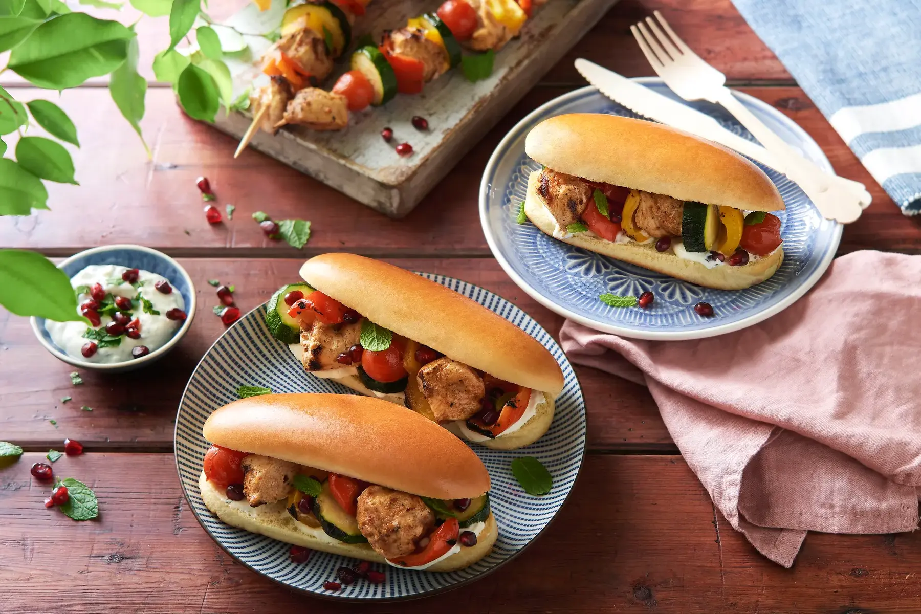 Bring a touch of Mediterranean sunshine to your next barbecue with these vibrant chicken kebab brioche hot dogs. Tender marinated chicken skewers grilled with colourful vegetables are tucked into soft, golden St Pierre Brioche Hot Dog Rolls, then finished with a drizzle of creamy yogurt sauce and a sprinkle of pomegranate for a burst of freshness.